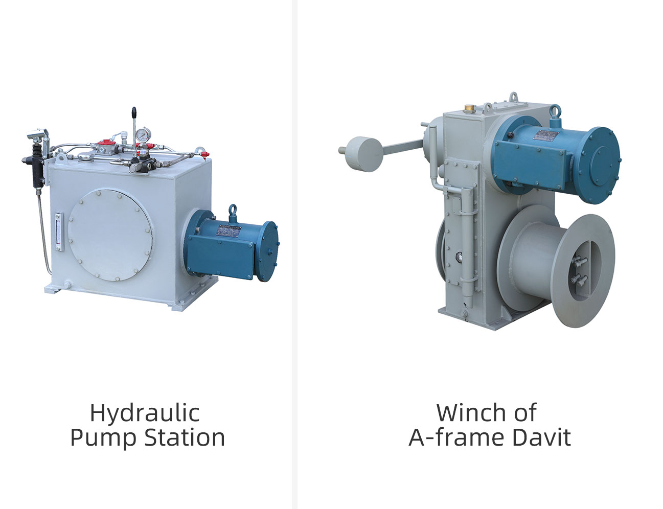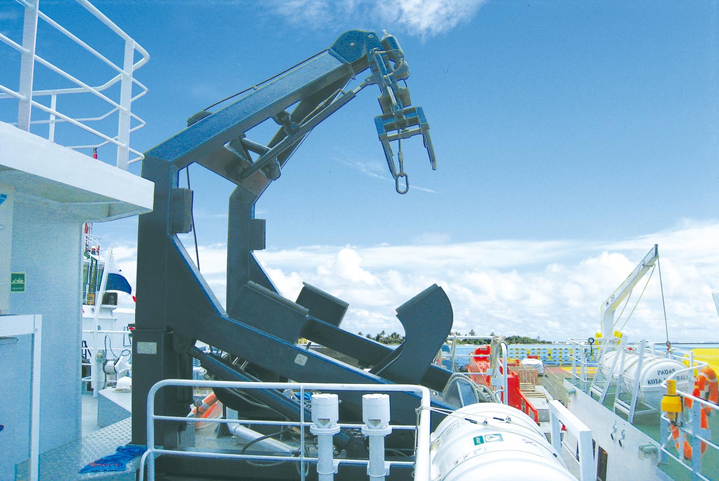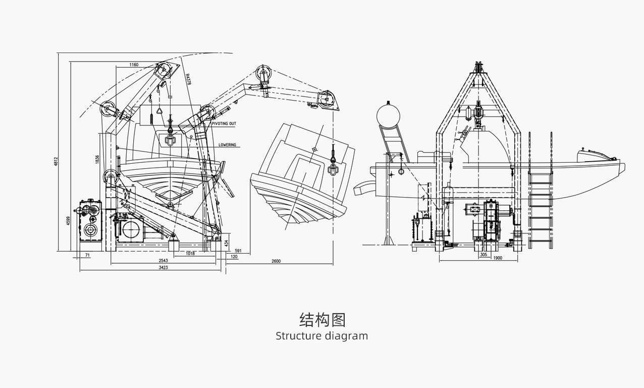 本裝置的設(shè)計(jì)、制造和試驗(yàn)完全符合1974年國(guó)際海上人命安全公約及其修正案第Ⅲ章第4、34條;經(jīng)MSC.226(82)和MSC.427(98)修正的MSC.81(70)《經(jīng)修正的就生設(shè)備試驗(yàn)建議》第1部分和第2部分;經(jīng)MSC.218(82)和MSC.425(98)修正的MSC.48(66)《國(guó)際救生設(shè)備規(guī)則》第I、VI章的要求。 本裝置為液壓驅(qū)動(dòng)倒出下降的吊艇架,在緊急情況下可通過(guò)蓄能器實(shí)現(xiàn)吊艇架倒出動(dòng)作。且艇上船員可通過(guò)遙控的方式下放救助艇。失電情況下可通過(guò)手搖泵提供液壓驅(qū)動(dòng),實(shí)現(xiàn)救助艇下放動(dòng)作。本裝置配套的電動(dòng)/液壓絞車可用于回收載員6人的救助艇。